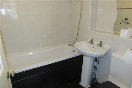 Bath with Triton shower over. Low level wc. Pedestal wash hand basin. Black tiled floor. Fully tiled walls. Extractor fan. Artexed ceiling.