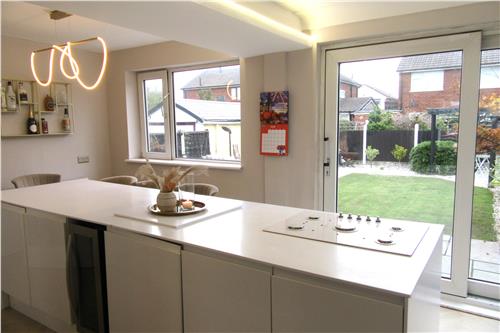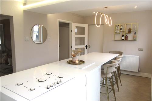 Opening from lounge. Large island with breakfast bar and Corian worktop. UPVC sliding doors. Plumbing for dishwasher. Integrated fridge freezer, microwave and oven. 5 ring gas hob. Space for wine cooler. Spotlights and feature light fitting. Door to utility.