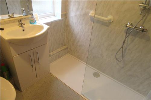 UPVC window to therear. Central heating radiator. Modern white low level wc. White pedestal wash hand basin with built in cupboard under. Walk in shower with glass screen. Extractor fan. Part tiled part plastic walls. Artexed ceiling.